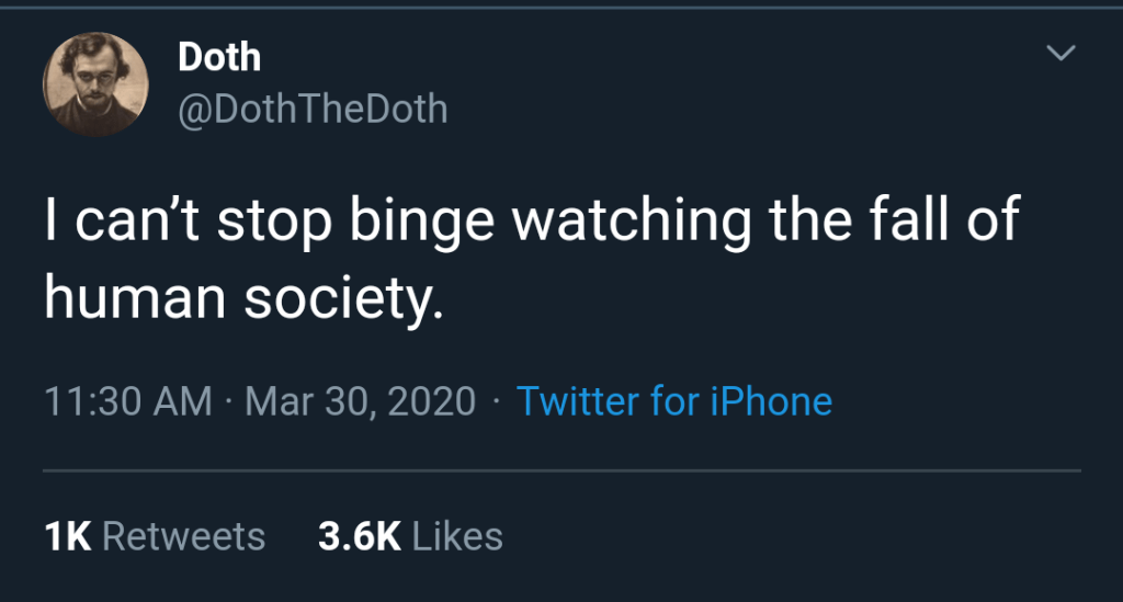 I may be one of the fear-loving dopamine junkies but a real, extended threat causing chronic stress is killing that dopamine kick. I’ll continue to pass on Pandemic and Outbreak, and The Stand can sit on my shelf for another year in my TBR pile. Because I don’t feel safe. It’s all just a little too soon.