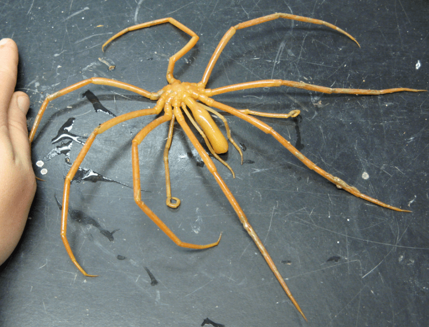 Most sea spiders are only the size of your fingernail, except in the Antarctic Ocean. Oxygen packs more tightly in cold water, fueling exponential growth of sea spiders whose legs would dangle out of your hand if you held it on your palm.